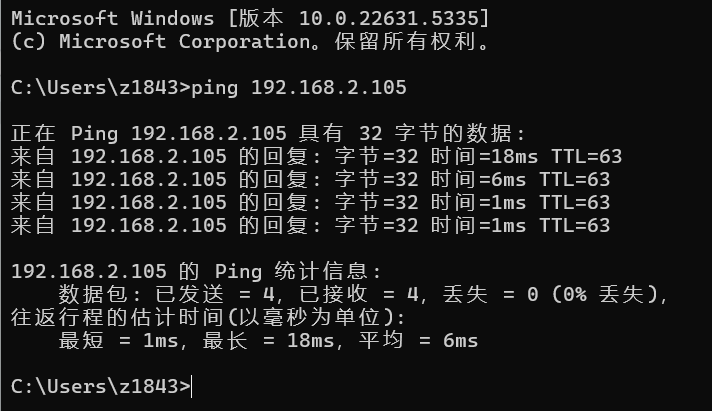 输入:ping 192.168.2.105,回车,如下图所示表示网络已打通。