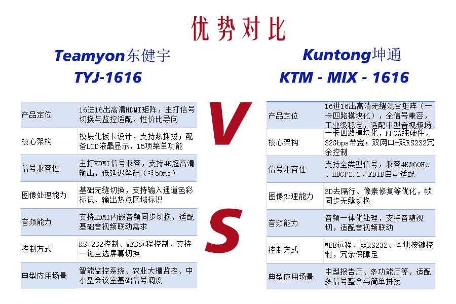 场景适配各有侧重。Kuntong坤通KTM-MIX-1616适配场景更多元,不管是中型会议室的音视频信号调度、高校智慧教室的多设备整合,还是报告厅的直播信号切换都很合适,尤其适合需要整合新旧多类型设备的综合项目。Teamyon(东健宇)TYJ-1616则重点锁定监控相关场景,像医药仓库、工厂车间、安防指挥室等需要接入多路监控信号的场所,能完美解决监控卡顿、延迟问题,特别适合对合规检查有要求的行业场景。